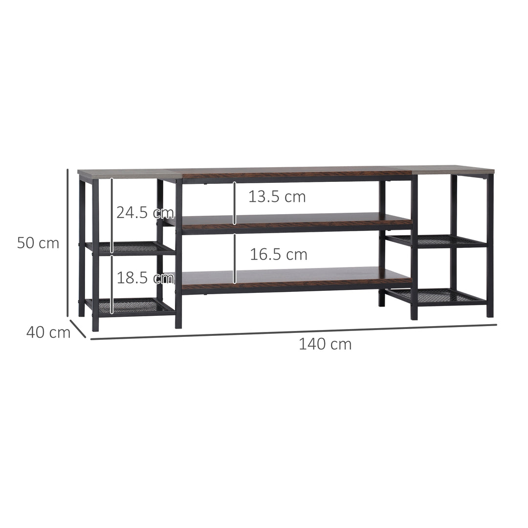 Upgrade your living room with this HOMCOM TV unit. It has six shelves and a large table-top: room for holding a TV and all the watching essentials you need. The open shelves of the TV stand are suitable for fitting plenty of differently-sized appliances. The black metal frame means a strong structure, whilst the wood-effect shelves create a striking look for industrial style. A must-have companion for every relaxing moment.