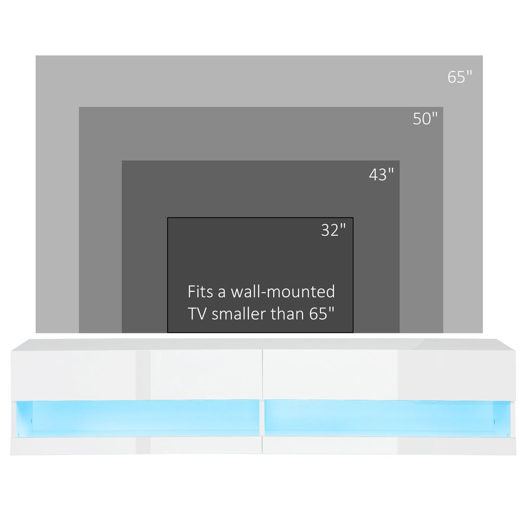 Bright, modern and cool: this HOMCOM floating TV cabinet brings high-gloss style into your living space. It also comes with LED lights: pick between the 16 different colours, four modes and change the brightness to create a mood you want. Features two shelves for handy storage, with half doors so you can still control media consoles without having to lift them up. A floating design - saves space and looks cool! Complete with cable holes to organise wires neatly.