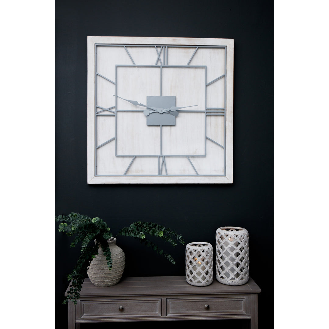 A distinctively modern aesthetic meets classical design in this showstopping square wall clock, featuring light grey metal Roman numerals that create a captivating contrast against its white-washed wooden frame. The artful skeleton-style face allows walls to peek through, adding depth and architectural interest to any space. Perfect for contemporary farmhouse, industrial, or minimalist interiors, this versatile timepiece pairs beautifully with chrome or metallic accents, as evidenced by complementary pieces like the Florence Chrome Table Lamp or the sophisticated Uthina Table Lamp. Create an inspired vignette by combining with stone accessories and faux botanicals such as the Stone Apple or Eucalyptus Plant in Stone Effect Pot for a curated, gallery-worthy display.