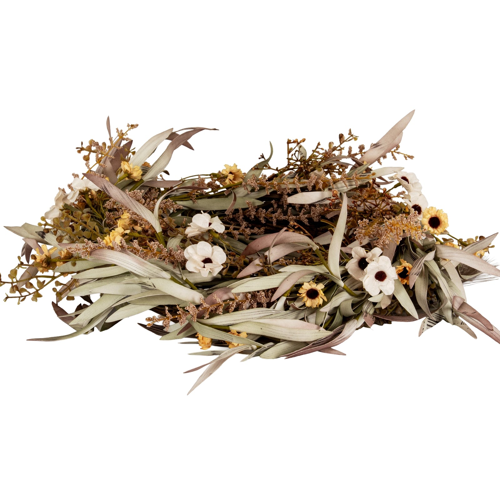 A delightful fusion of seasonal blooms adorns this beautiful wreath, bringing the freshness of an English garden into your space. The carefully arranged stems create a lush, dimensional design that catches light and casts gentle shadows, making it an ideal focal point for any retail display. This wreath pairs wonderfully with the Regola Matt White Ceramic Vase for a clean, modern aesthetic, while the Tiber Large Matt White Ceramic Vase offers a statement-making alternative for larger spaces. For an enchanting lighting arrangement, consider displaying alongside the Darcy Antique White Table Lamp with its refined linen shade, or the distinctive Pella Table Lamp. The wreath's neutral palette and thoughtful composition complement both the Washed Wood Round Framed Mirror and Black Wood Round Framed Mirror, creating opportunities for stunning wall arrangements that will appeal to design-conscious customers. Perfect for boutiques and home decor retailers seeking to offer their clientele enduring style with contemporary appeal.