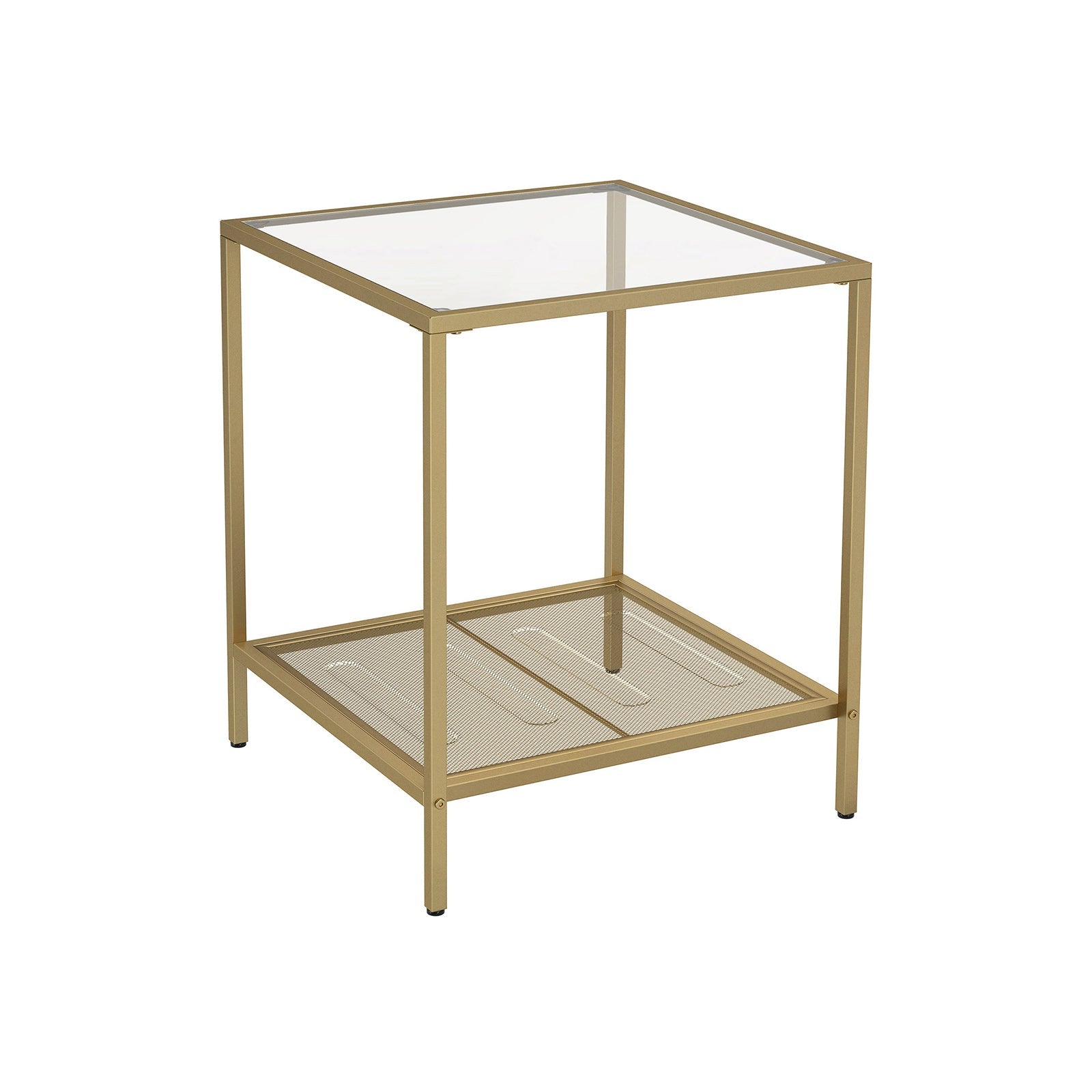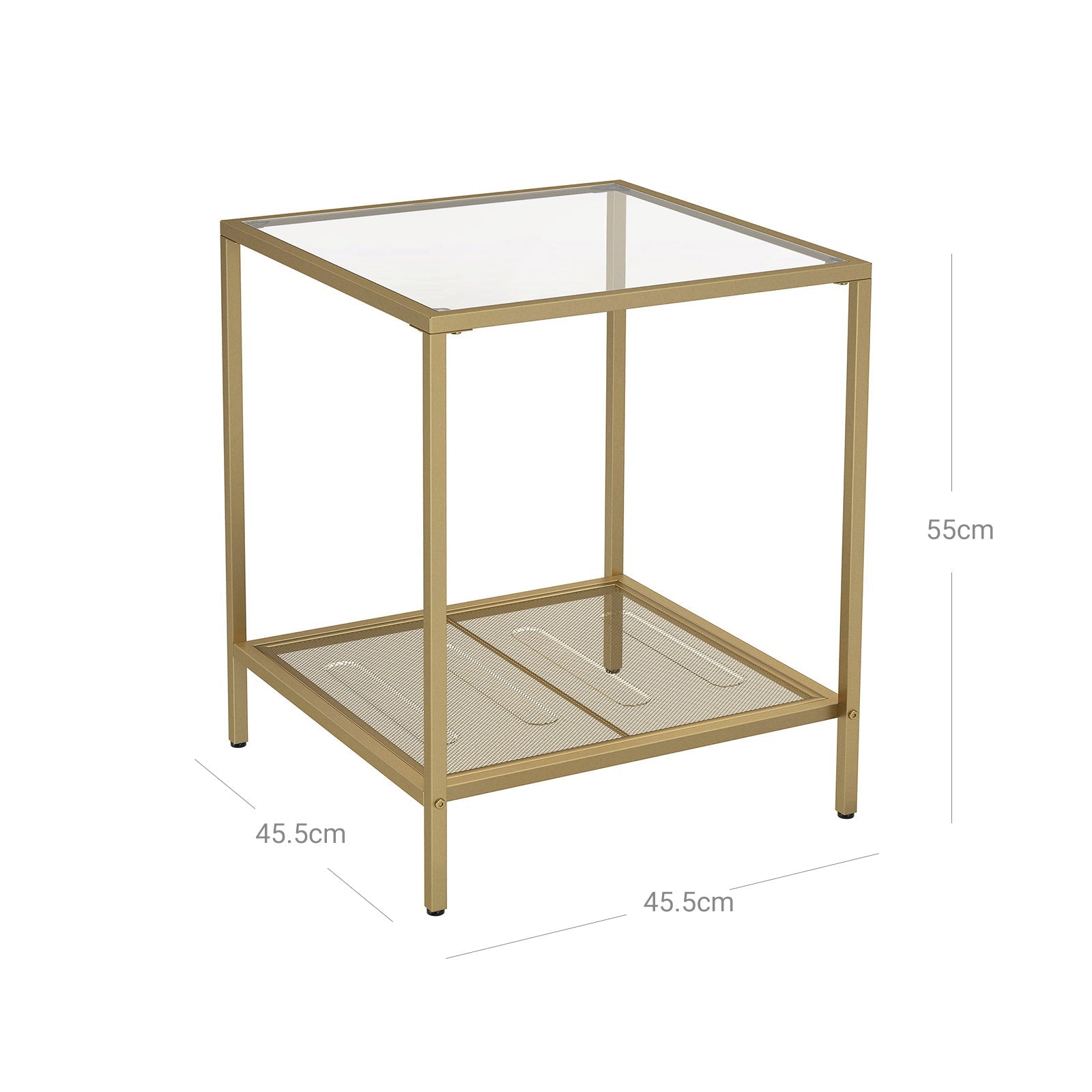 • Double the Space: Taking up only 45.5 x 45.5 cm of your floor space, this side table offers double space in return. Remote controls and a coffee mug on top, snacks on the mesh shelf... everything will be at hand