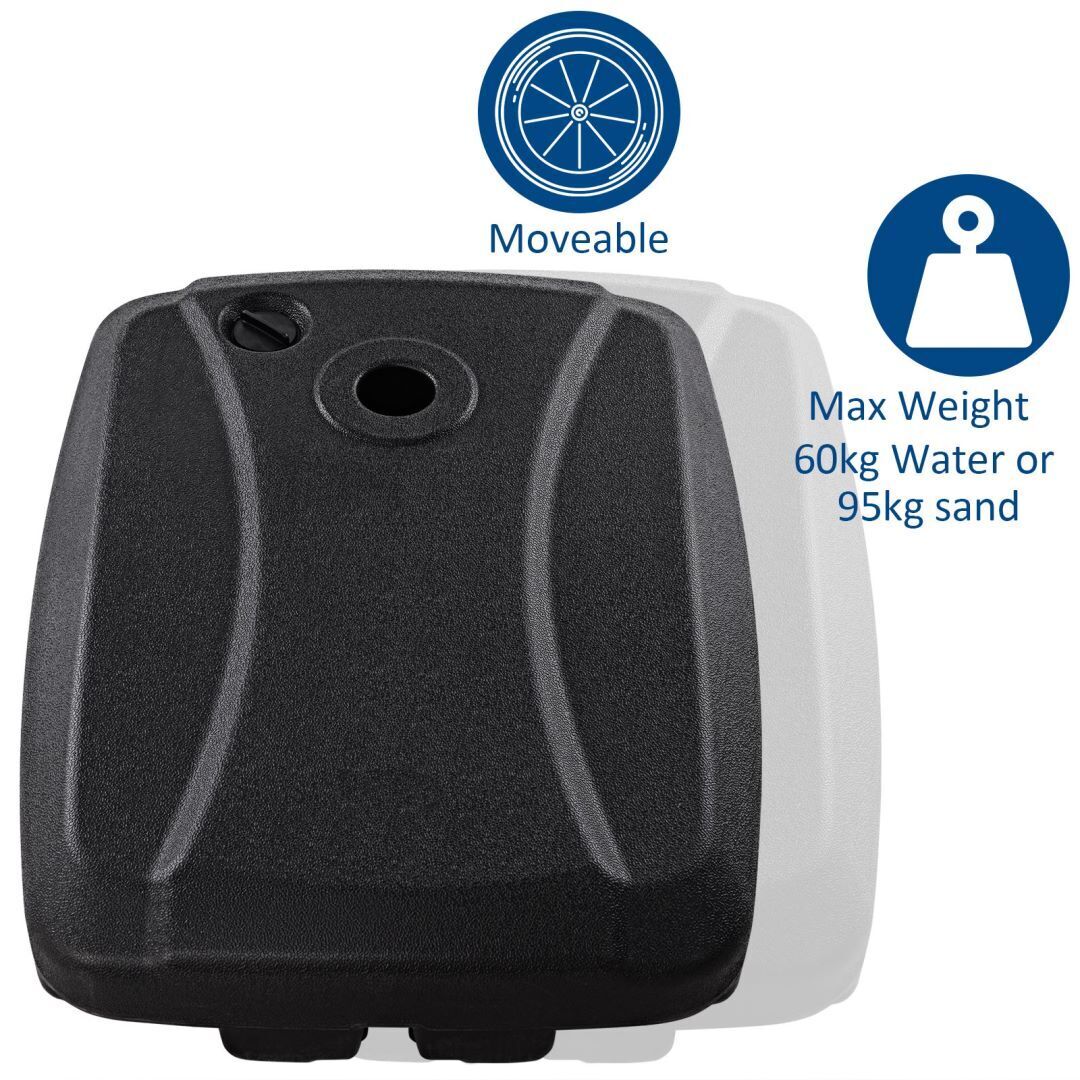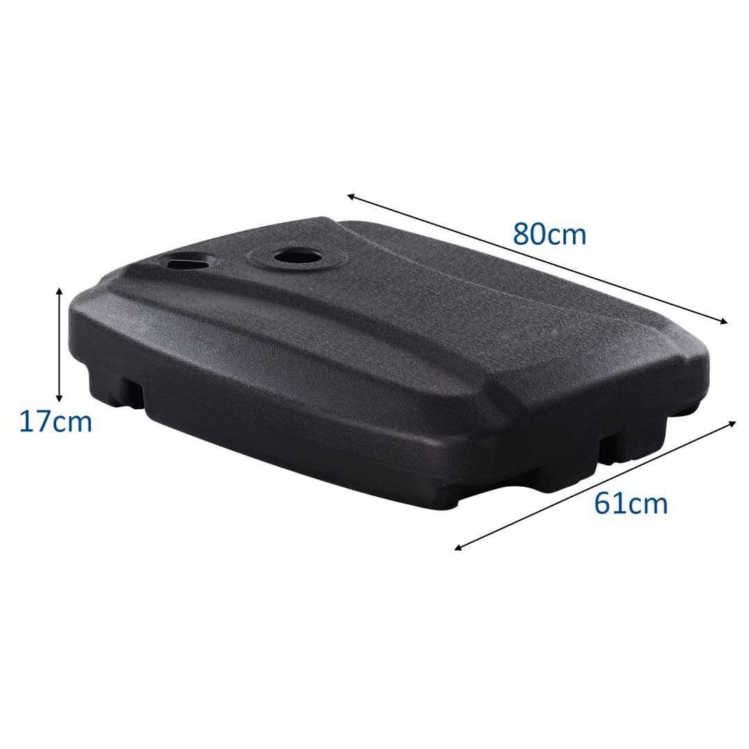 The strong HDPE plastic frame holds water up to 60kg, sand up to 95kg, providing protection against extreme weather. Thanks to the firmly sealed spout, there will be no leakage of sand or water, keeping your properties tidy and clean. This wheeled patio umbrella base is built with grooves to facilitate portability. And it is easy to install your cantilever offset umbrella over our umbrella base weight and enjoy delightful times in your yard, patio and poolside. If you are looking for such a product, don't hesitate to place an order! Stable Weight Addable Design: Fill the offset umbrella base with sand, water or a mixture of both to achieve the weight you need to anchor your umbrella in windy conditions. The maximum weight can reach up to 95 kg when filled with sand. In addition, it is easy to fill and empty with a firmly sealed spout. Hard Material for Weather Resistant: This cantilever umbrella base can withstand harsh outdoor environments and ever-changing weather all because of the selected HDPE plastic. Generally speaking, it does not deform, crack or fade easily. Mobile Stand of Convenience: Featuring a set of wheels and easy-grip hand grooves, it is likely to be less strenuous while moving this umbrella stand back and force. Relocate the patio offset umbrella in gardens, yards, pool sides or wherever a sturdy base is needed. Easy to Set Up: We will offer you detailed instructions to help install your patio umbrella on the base. First detach the crossbar, slide an umbrella pole (not included) over the base and attach the pole with the crossbar, then bolt the crossbar right back with the base. Finally, fill the reservoir with water and sand. Applicable Kinds: This patio umbrella base is used for anchoring the majority of cantilever umbrellas or many of the offset umbrellas with a cross base. Make sure the umbrella pole is within the diameter of 7cm. Base dimension: 80 x 61 x 17cm (L x W x H).