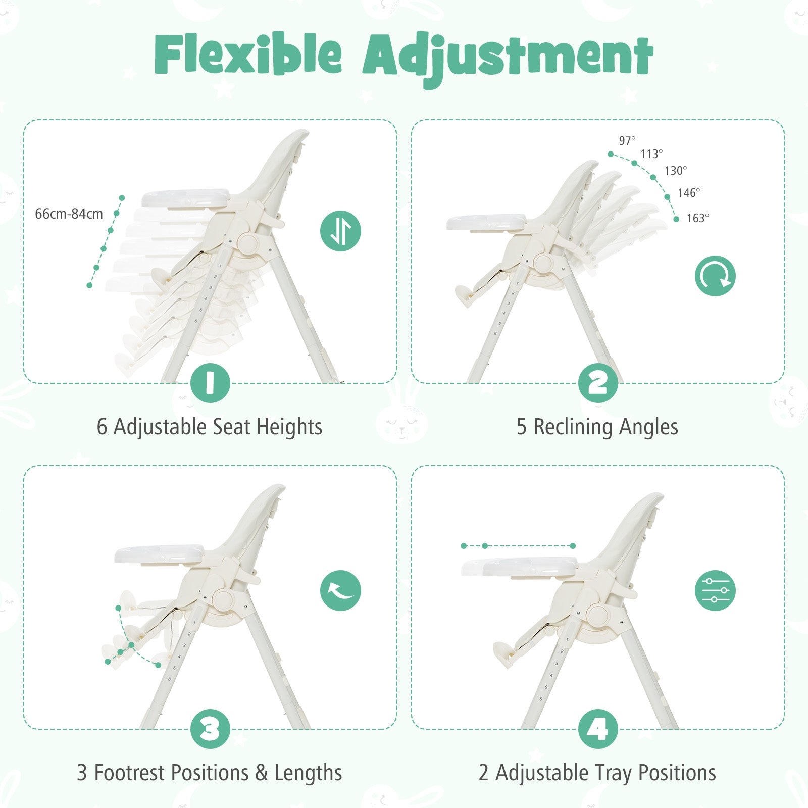 Featuring 6 heights, 5 recline positions, 2-position tray and 3-position footrest with 3 adjustable lengths, this adjustable and multifunctional high chair offers customized comfort and can grow with your baby. Besides, 4 universal wheels make it easy to move the chair anywhere. And the wheels can be firmly locked to prevent sudden sliding. In addition, this baby high chair is constructed of rustproof metal tube frame and BPA-free PP trays that are harmless to your baby's health and can be used for a long time. Thanks to the 5-point safety harness and anti-falling baffle, babies will have a secure dining and playing area on this high chair. The waterproof PU cushion cover and removable tray are easy to wipe clean. When not used, the high chair can be quickly folded and placed in the corner to save space. Freely Adjustable Baby High Chair: This baby high chair has multiple adjustments to meet your needs. The 6 adjustable seat heights, 2-position adjustable tray and 3-position angle and length adjustable footrest make it suitable for babies of different ages. Besides, 5 reclining angles are designed for feeding, playing, etc. Stable and Safe Design: Made of rustproof metal tubes and supported by a stable A-shaped structure, this baby high chair ensures high stability and long-lasting use. In addition, the chair comes with an anti-falling safety baffle and 5-point safety harness with 2 adjustable positions to keep babies secure in the chair. Easy Movement and Quick Folding Design: Equipped with 4 universal wheels, this infant feeding chair can be moved from room to room effortlessly. Meanwhile, the lockable design ensures high security. The space-saving folding design allows for easy storage and transportation. The trays can be placed on the back legs to save more space. Removable and BPA-free Double Trays: This baby high chair is equipped with double trays for eating, feeding and playing. Made of high quality and harmless PP material, the trays are safe for babies to use. What's more, the removable trays are waterproof, dishwasher safe and easy to clean. Detachable and Comfortable PU Cushion: Filled with thick and high-density sponge, the removable seat and backrest cushion is comfortable for babies to sit in. Moreover, the PU leather cushion cover is waterproof, stain-resistant, skin-friendly and anti-tear. You can conveniently use damp cloth to wipe it clean.