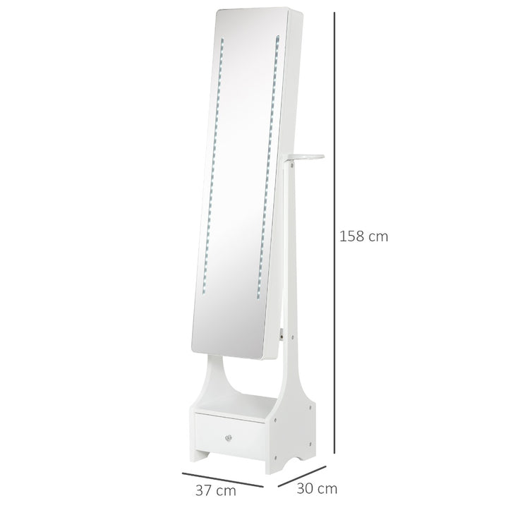 Keep all your jewellery organised and easily accessible with this storage mirror armoire from HOMCOM. On the outside, a full-length mirror is fitted with two strips of LED lights so you can get ready day and night. Inside features 56 earring slots, 15 necklace and bracelet hooks, 77 ring slots, multiple shelves and a large bottom drawer, giving you plenty of room for keeping everything stored and organised. The MDF frame is solid and reliable for everyday use, holding the mirror on firmly. The mirror angle can be adjusted to suit you, and it's finished with a hairdryer holder for extra efficiency and ease when getting ready. 6 x AA batteries required for the lights, not included.