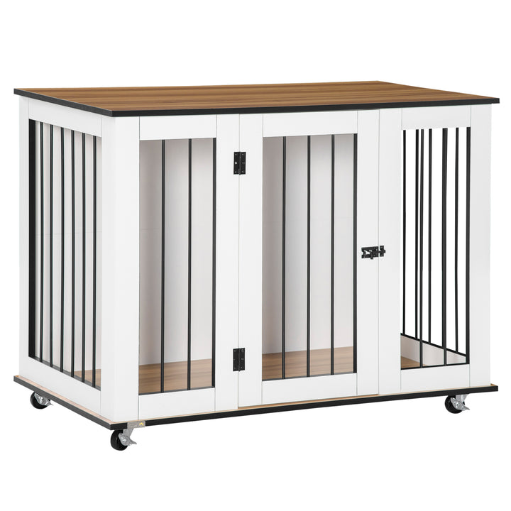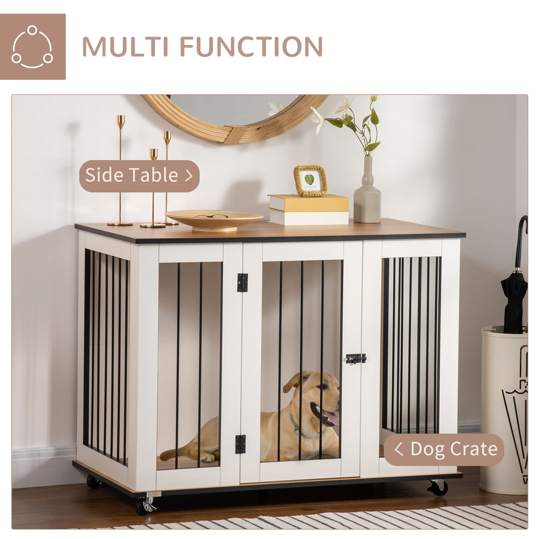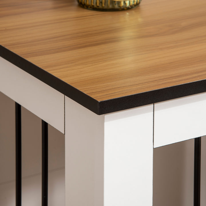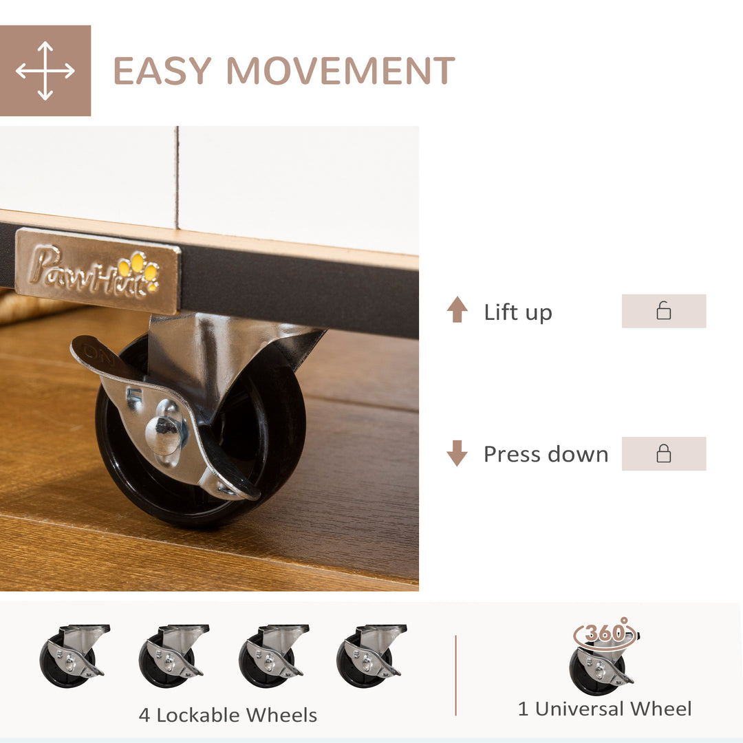 This stylish PawHut dog crate table, which acts as a side table too! Pets have a spot for relaxing, whilst you have a large top for displaying your favourite pieces. Wheels at the bottom for easy movement, you can roll it around the home, keeping pets nearby if needed. Steel bars on the windows for ventilation, whilst the raised floor stops dampness and moisture from seeping through, keeping pets comfortable. Finished with lockable doors for security, pets are safe and secure when inside.