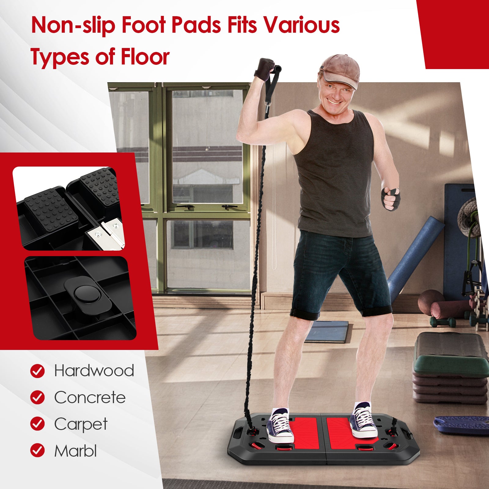 Enjoy exercise just at home with this push up board set! Equipped with complete accessories, the push up board set realizes various exercise methods. You have the final say that several accessories are needed each time. Moreover, the upgraded push up board aims to build up different muscle groups for a total and safe workout every time. It is time to say goodbye to traditional pushups. In addition, you can fold the base board and put other items in the storage bag when not in use. The lightweight design allows you to carry this strength training equipment easily. Thus, you can start to exercise whether at home or in the gym. Full Body Workout: This push up board set targets a variety of body parts, including the back, shoulders, triceps, chest, abdomen and thigh. As a result, you are able to fulfill a full-body workout with this strength training equipment. Flexible Combinations: Coming with complete accessories, the push up board set allows you to combine these parts in different ways. The elastic strings can be used with the handle or the pilate bar. Likewise, you can obtain various combinations with the push up handgrips, ankle straps and door anchor. Foldable and Lightweight Design: The base board is lightweight and can be folded into a compact size of 50 x 4 x 43 cm (L x W x H). Besides, putting other accessories in the drawstring storage bag, you can bring this push up board set to the desired place for exercise. Also, it is easy to stow it anywhere. High Quality Materials: The foldable push up board features a tough ABS body. The 3 mm EVA cushion as well as the anti-slip handle will offer you ultimate comfort while exercising. What's more, the non-slip design at the bottom helps stabilize your whole body during workout. Perfect Gift for Fitness Crowd: With the complete accessories, this push up board set gratifies the changing requirements of fitness beginners and enthusiasts. The smart design renders the time and place of workout unlimited. Therefore, the strength training equipment is an ideal gift for men and women who love fitness.