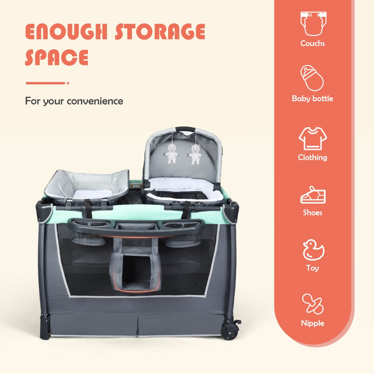 This baby playpen/travel cot provides a safe and comfortable place for your baby to play or sleep. The breathable mesh sides allow air to flow around your child and also offers an ideal way to check on your child whilst sleeping or playing. With the removable bassinet, the baby play bed grows with your child from new-born to infant to toddler, do not hesitate to place an order! ● Nappy Changing Mat and Removable Bassinet: Designed to grow with your child, the baby travel cot has both a removable bassinet and nappy changing mat. The mat is at a comfortable height for a parent or carer and an additional bag for nappies, creams and lotions makes this changing mat convenient for those important nappy changes. The bassinet is ideal for a new-born to sleep or lay with a musical box and mobile offering to attract attention and curiosity. ● Music Box and 2 Hanging Toys: The removable bassinet has a hood with 2 hanging toys to aid in the visual development of your child and also encourages your child to grasp them. A soothing music box is also attached to the bassinet, helping to sooth your child to sleep. ● Features: The baby crib has two universal wheels, with brakes, making it easy to move when in use. The two side mesh panels encourage air circulation and are ideal for parents or carers to observe their child. A baby tidy, suitable for nappies, creams, lotions and bottles etc., can be hung on a side of the cot for convenience when changing your child. ● Detachable and Foldable Design: The accessories, bassinet, changing mat and baby tidy, are all removable, allowing the basic travel cot/playpen to be folded and stored when not in use. The item comes with a handy storage bag which makes transporting the cot easy and offers your child their own space when visiting friends and family. ● Baby Tidy: A baby tidy, suitable for nappies, creams, lotions and bottles etc., can be hung on a side of the cot for convenience when changing your child.