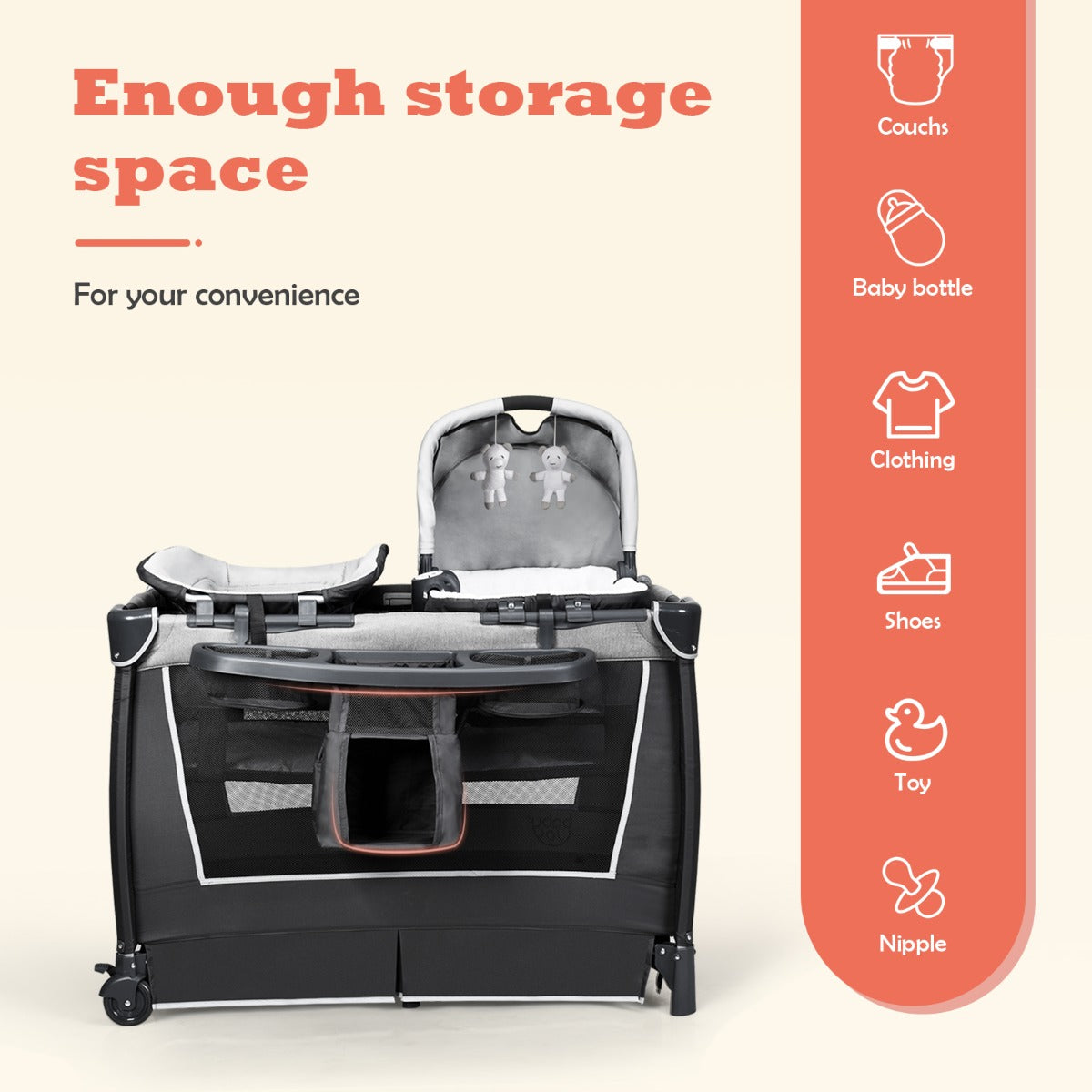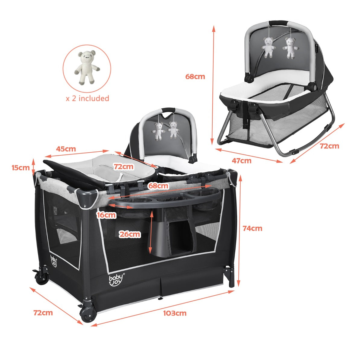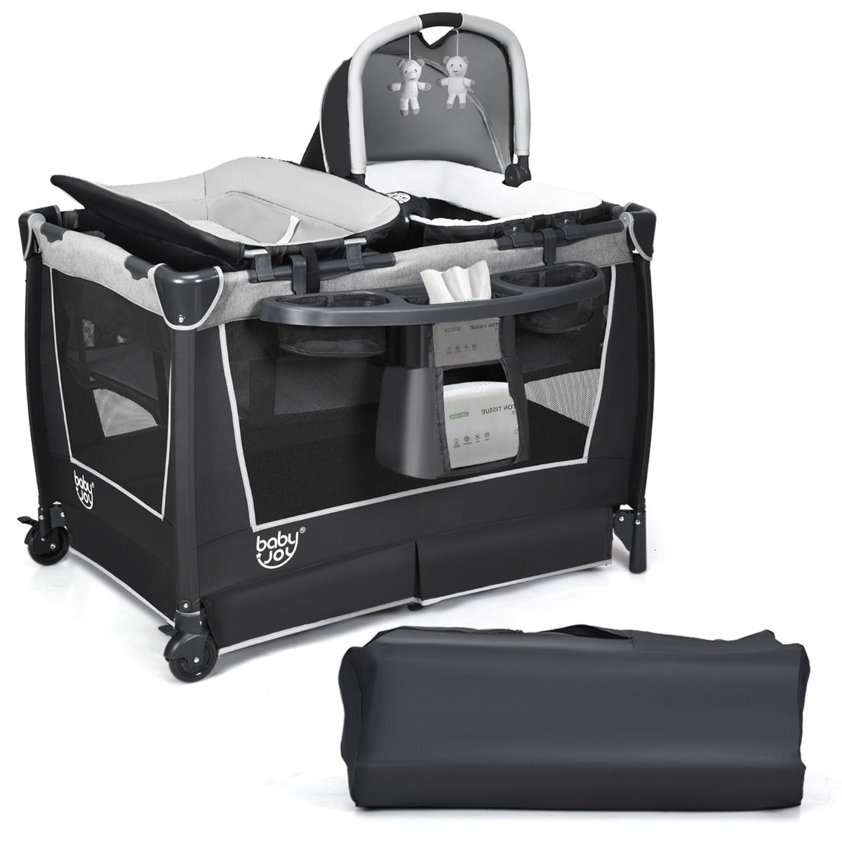 This baby playpen/travel cot provides a safe and comfortable place for your baby to play or sleep. The breathable mesh sides allow air to flow around your child and also offers an ideal way to check on your child whilst sleeping or playing. With the removable bassinet, the baby play bed grows with your child from new-born to infant to toddler, do not hesitate to place an order! ● Nappy Changing Mat and Removable Bassinet: Designed to grow with your child, the baby travel cot has both a removable bassinet and nappy changing mat. The mat is at a comfortable height for a parent or carer and an additional bag for nappies, creams and lotions makes this changing mat convenient for those important nappy changes. The bassinet is ideal for a new-born to sleep or lay with a musical box and mobile offering to attract attention and curiosity. ● Music Box and 2 Hanging Toys: The removable bassinet has a hood with 2 hanging toys to aid in the visual development of your child and also encourages your child to grasp them. A soothing music box is also attached to the bassinet, helping to sooth your child to sleep. ● Features: The baby crib has two universal wheels, with brakes, making it easy to move when in use. The two side mesh panels encourage air circulation and are ideal for parents or carers to observe their child. A baby tidy, suitable for nappies, creams, lotions and bottles etc., can be hung on a side of the cot for convenience when changing your child. ● Detachable and Foldable Design: The accessories, bassinet, changing mat and baby tidy, are all removable, allowing the basic travel cot/playpen to be folded and stored when not in use. The item comes with a handy storage bag which makes transporting the cot easy and offers your child their own space when visiting friends and family. ● Baby Tidy: A baby tidy, suitable for nappies, creams, lotions and bottles etc., can be hung on a side of the cot for convenience when changing your child.