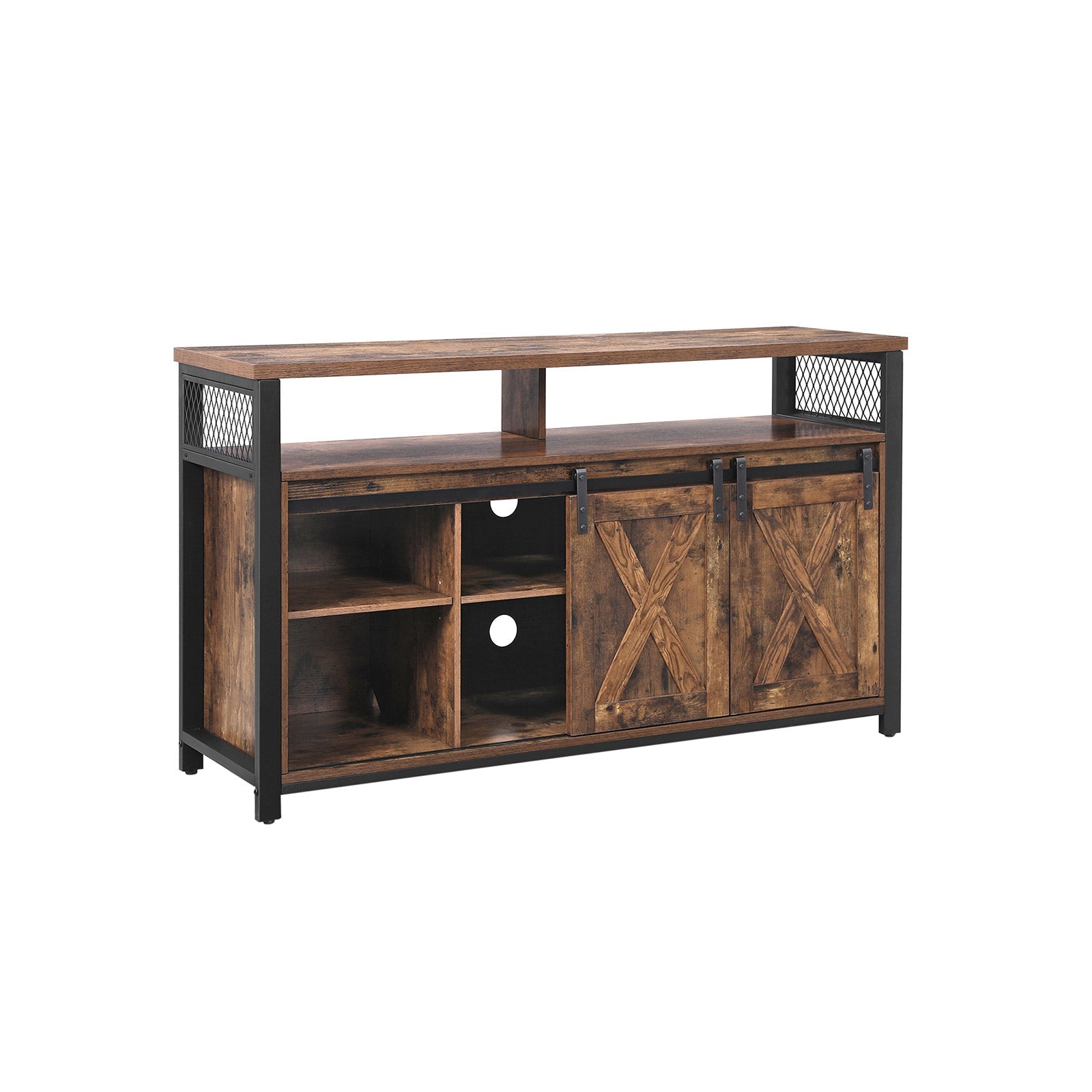 - Space for All: A pair of barn doors sliding on a steel track accentuates the TV cabinet with more character; 2 adjustable shelves Behind the Doors, 2 open compartments, and a large shelf under the tabletop keep all your games and a media player in one place