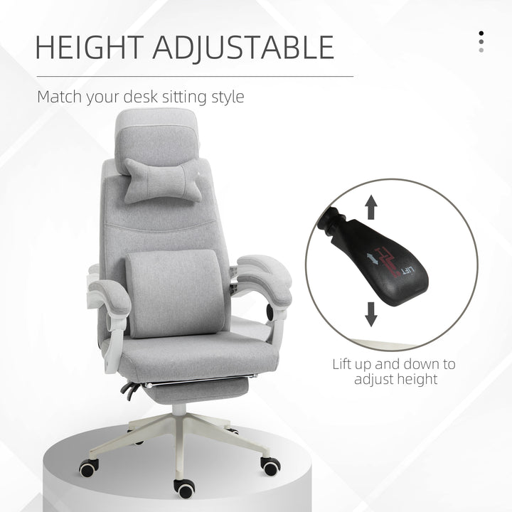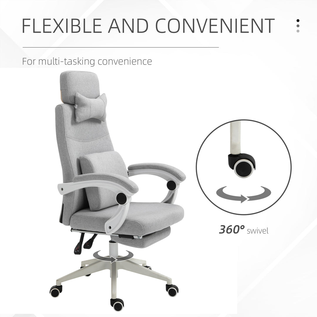 Make working all day comfortable and easy, thanks to this Vinsetto office chair with footrest. The tall back and armrests offer support; the back reclines back to a maximum 160° - paired with the manual footrest, you can rest back and relax whenever. Padded for comfort, it comes with a top and back pillow for extra support and comfort. Complete with five wheels to move this pc chair around easily.